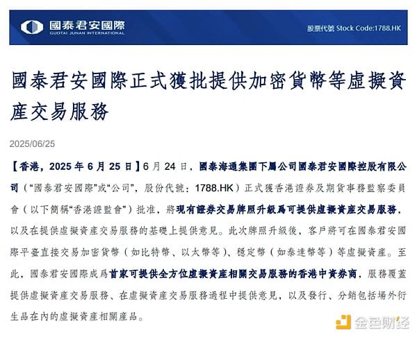 2025 年 6 月 25 日,国泰君安国际正式释出公告:已正式获批提供加密货币等虚拟资产交易服务。客户将可直接在其平台交易比特币、以太坊等加密货币及 USDT 等稳定币。
