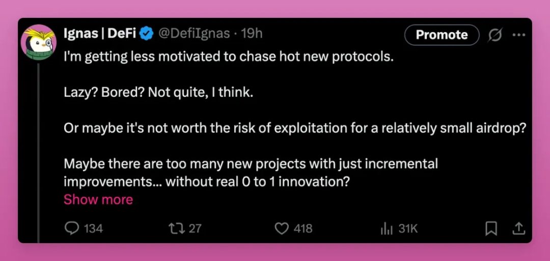 我在 X 平台分享过,如今追逐新项目的动力已降至 2018 年踏入加密领域以来的最低点。即便是熊市,心态都要比现在好。