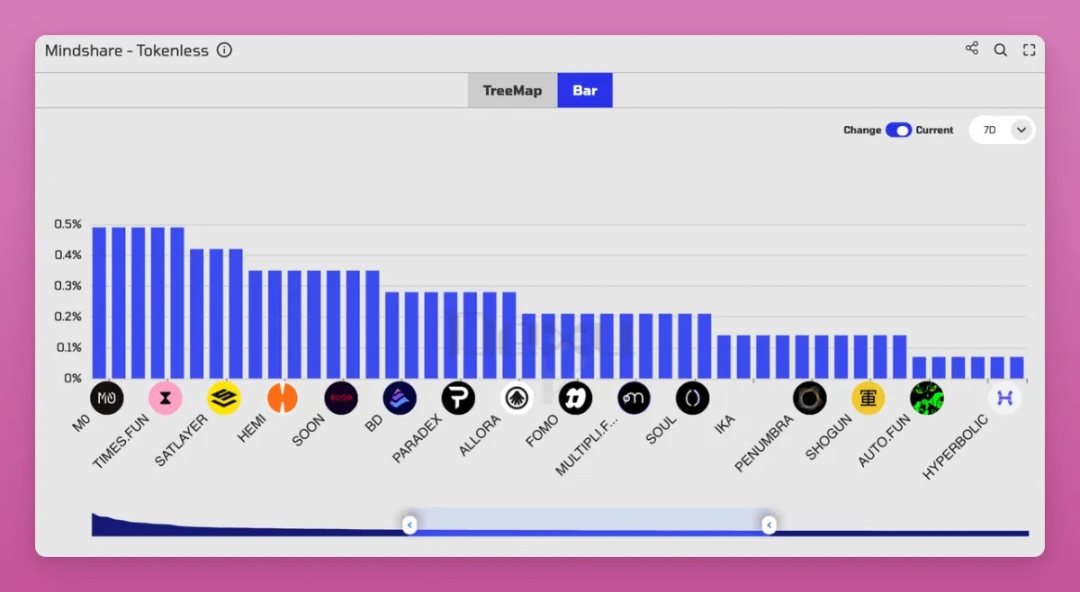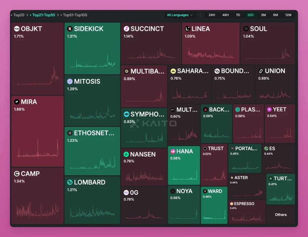 值得关注的是,Kaito 提供免费数据看板,按「心智份额(Mindshare)」罗列头部非代币项目。尽管 Top 20 项目的截图频繁刷屏,但 Top 21-50 中的项目你能认出几个?