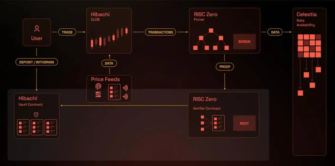 Hibachi 是一个面向专业交易者的去中心化衍生品交易协议,致力于在保持 CEX 级交易体验的同时,提供链上可验证的透明性与安全性。该协议由 Celestia、Risc Zero 和 Hashflow 提供支持,目前已部署在 Base 网络上。