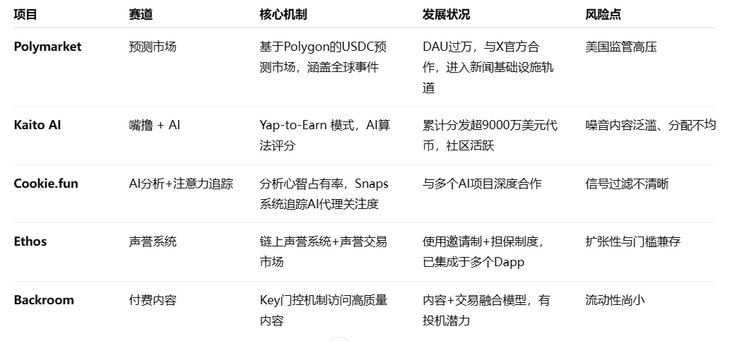 预测市场通过市场定价机制将认知共识变现;嘴撸生态则将发言变为经济行为;声誉系统在构建一种可继承、可抵押的社会资本;注意力市场更是将热点趋势作为交易标的,通过「信息发现 -> 押注信号 -> 获得差价」的逻辑重新定义内容价值;而 AI 驱动的 InfoFi 应用,则通过大规模语义建模、信号识别、链上交互分析,试图构建一个由数据与算法驱动的信息金融网络。这些机制使得信息首次具备了“现金流”属性,也使“说一句话、转一条推、背书某人”变成真正的生产活动。