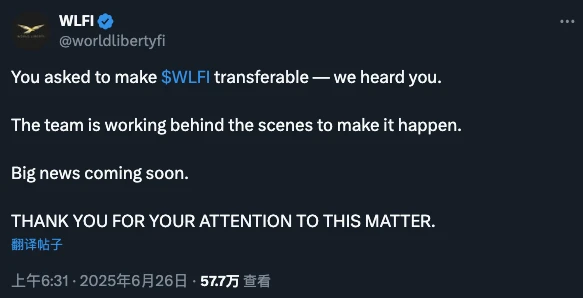 今晨,特朗普家族加密项目 World Liberty Financial(WLFI) 发帖 称即将有重大新闻发布并暗示与开启代币转移有关。社区对于 WLFI 的热情再度高涨,高呼“大的要来了”。