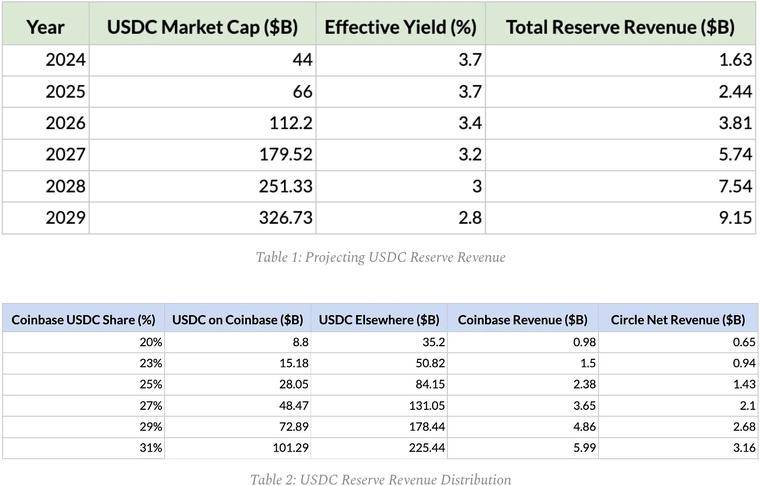 为了更好地理解 USDC 的长期经济模型,基于这些核心要素,对 Circle 和 Coinbase 双方到 2029 年的净收入进行了预测建模。