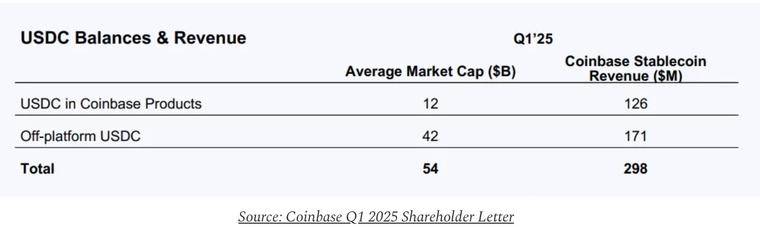 基于这种安排,双方都有动力扩大 USDC 的采用率。Coinbase 在推动 USDC 增长方面发挥了至关重要的作用,通过其交易所、Base Layer-2 network(目前承载着 370 亿美元的 USDC)以及 Coinbase Payments 等新产品,显著提升了 USDC 的分销能力。根据 Circle 的 S-1 文件,Coinbase 持有的 USDC 份额稳步增长,从 2022 年的约 5% 升至 2023 年的 12%,再到 2024 年的 20%。截至 2025 年第一季度,该份额已占总供应量的 22%,即其各个平台共计持有 120 亿美元的 USDC。