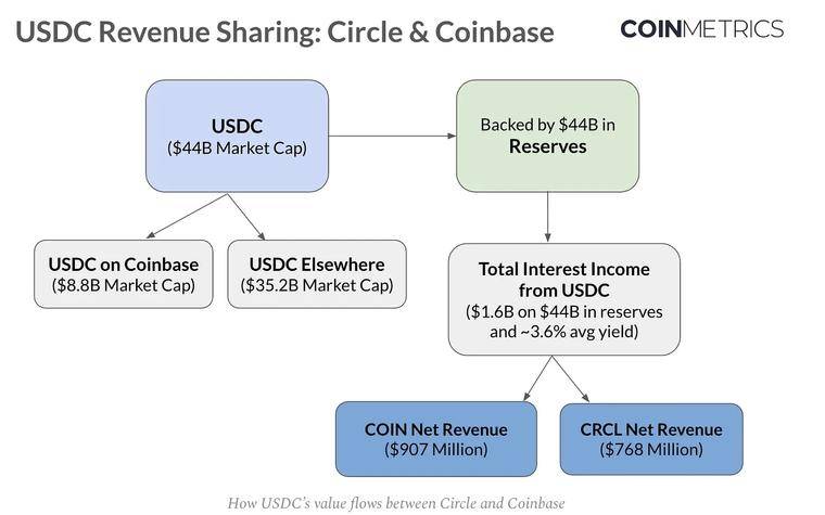 尽管 Circle 仍是 USDC 的唯一发行方,但它并未捕获其全部价值。凭借在 Circle 的股权以及与之达成的收入分成协议,Coinbase 赚取: