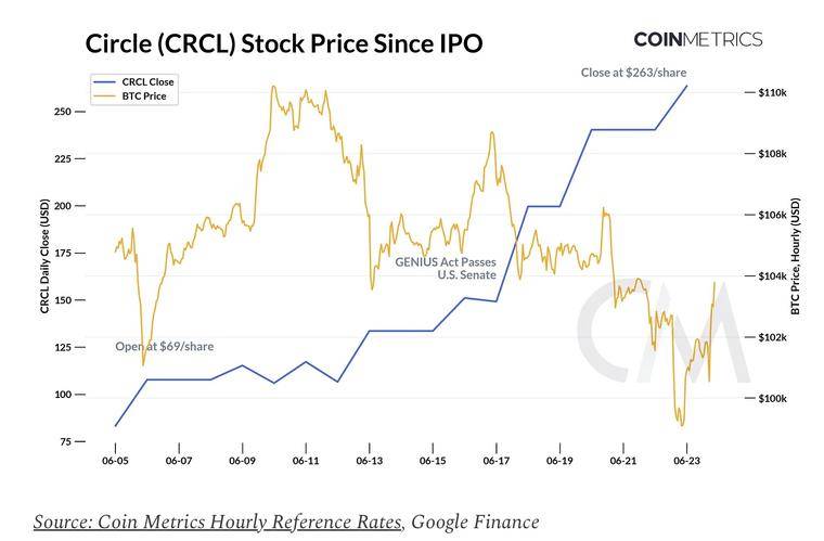 Circle 的 IPO 来得正是时候,得益于美国参议院通过的《GENIUS 法案》的推动。结合市场对合规数字美元日益增长的需求,Circle 正在充分利用市场对纯稳定币敞口的浓厚兴趣。其强劲的首秀表现也点燃了市场对其他加密公司(如 Bullish 和 Gemini 交易所)进行 IPO 的兴趣,同时刺激了公开市场活动的增加,并重新引发了人们对稳定币经济学的关注。