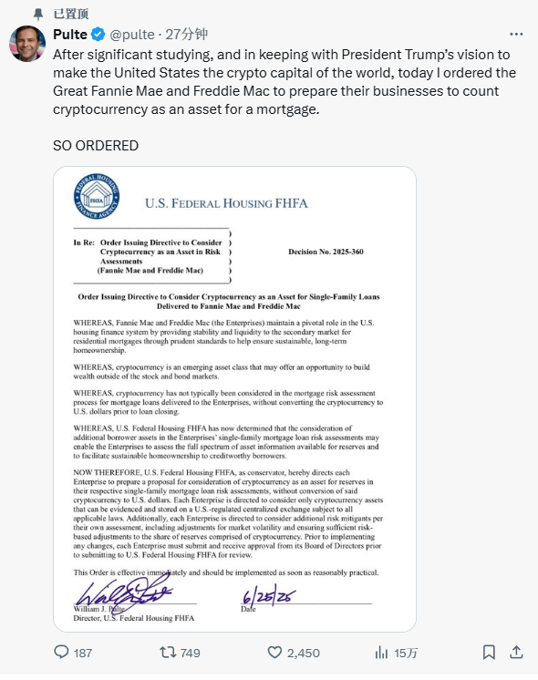 当地时间周三,一则社交媒体帖子,在美国房地产金融界撕开了一道通往未知领域的口子。联邦住房金融署(FHFA)署长威廉·普尔特亲自下场,指令美国住房抵押贷款市场的两大「压舱石」——房利美和房地美——为接纳加密货币作为抵押品做好准备。这则消息没有通过任何官方新闻稿的冗长铺垫,以一种极具时代风格的突袭方式,将一个宏大愿景推至台前:将美国打造成「世界加密货币之都」。