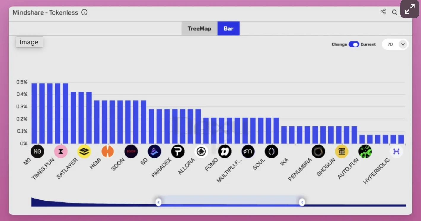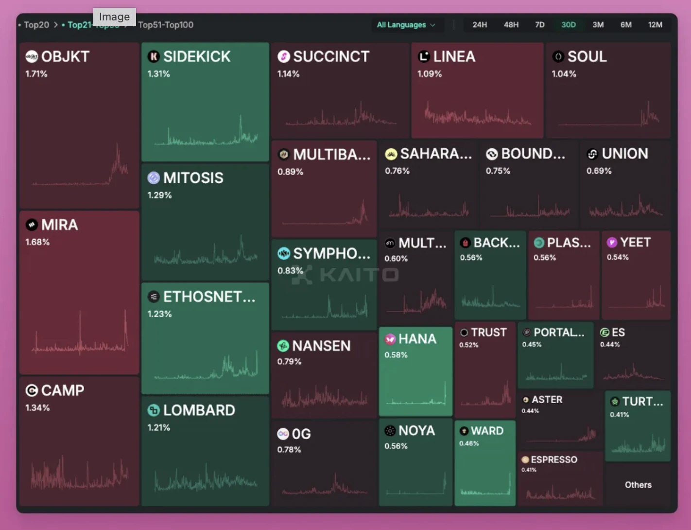 Kaito 的旗舰门户每月费用为 1099 美元(按两年期则降至 750 美元),好在 Kaito 提供了一个免费的仪表板,上面按 Mindshare(心智份额)列出了热门项目,且大多没有推出代币。 前 20 个项目的截图经常被分享,但你认出前 21-50 个项目中的几个呢?