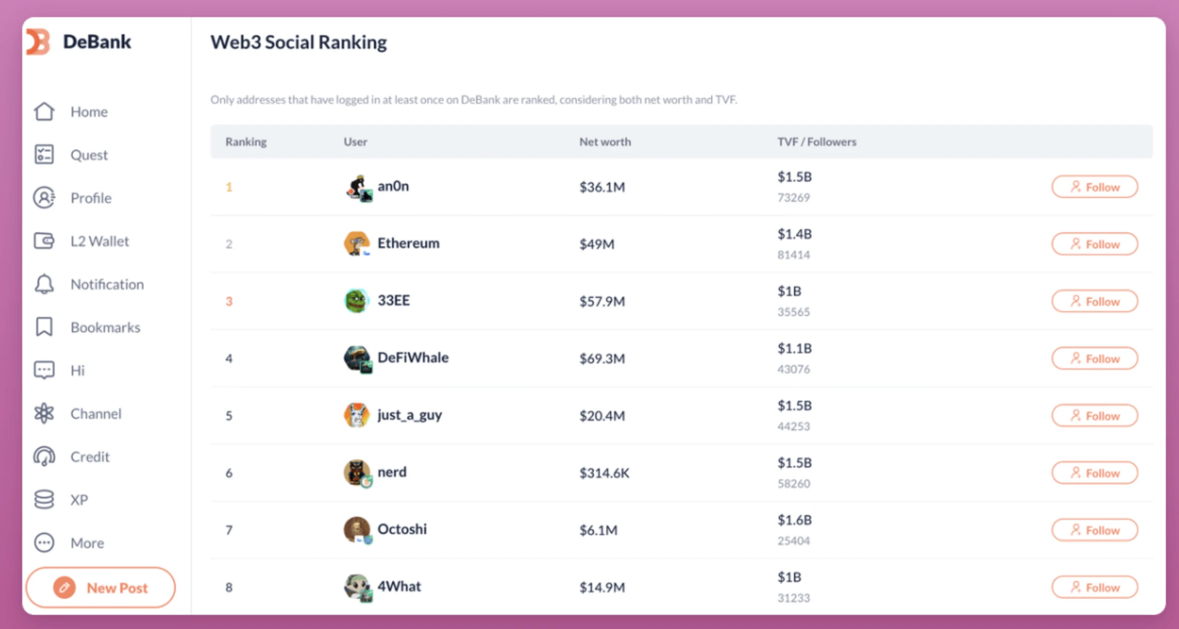 感觉 DeBank 在 X 上的市场份额已经减少,因为其旗舰产品已被整合到 Rabby 钱包上,单 使用 DeBank 个人资料跟踪功能还是可以发现大量的 Alpha 机会: