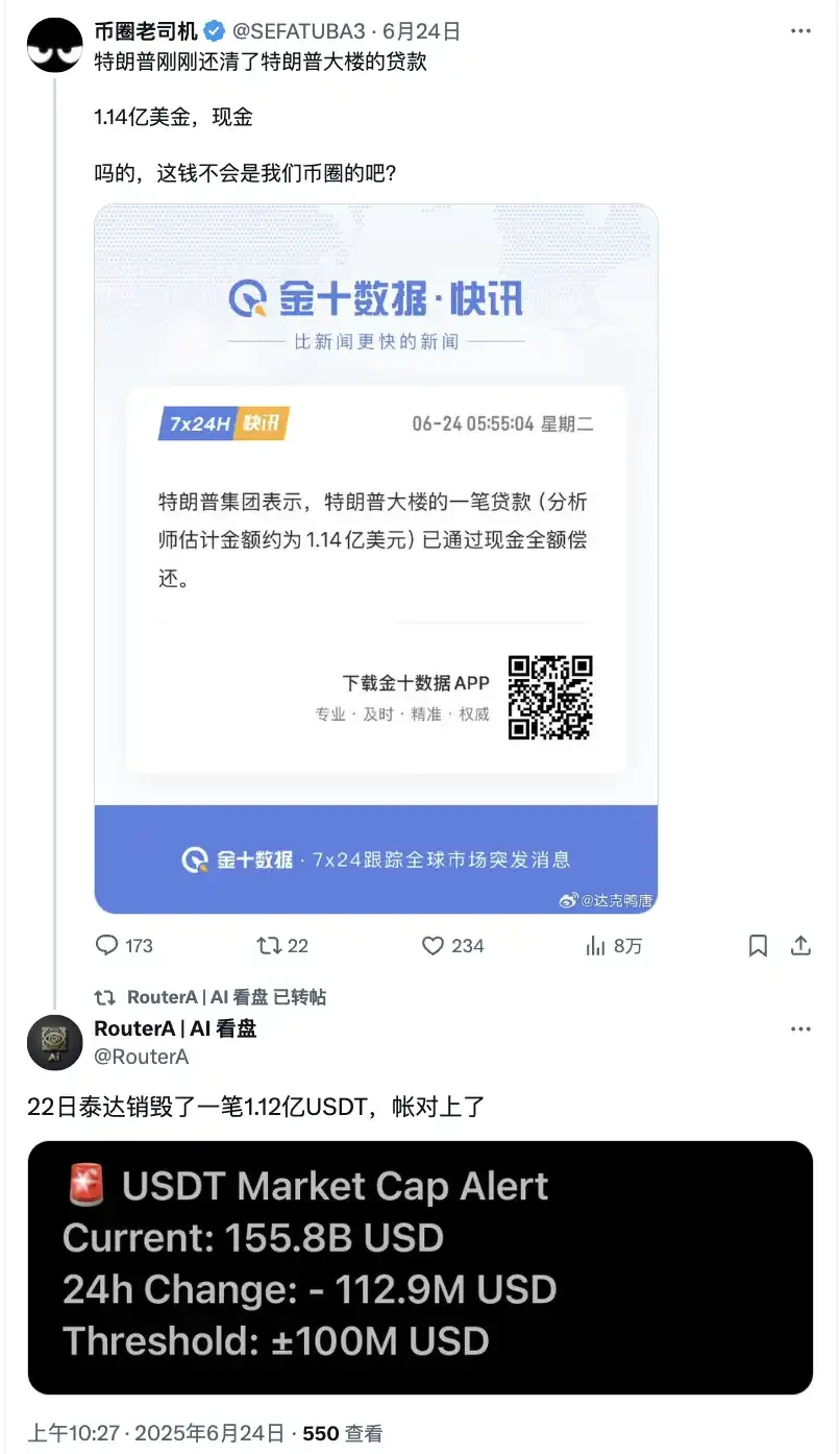 就在特朗普还完贷款的新闻爆出后,有有网友敏锐地发现——6 月 22 日,一笔高达 1.12 亿美元的 USDT 从波场(TRON)链上被销毁,而这笔资金,很可能正是他的还款来源。