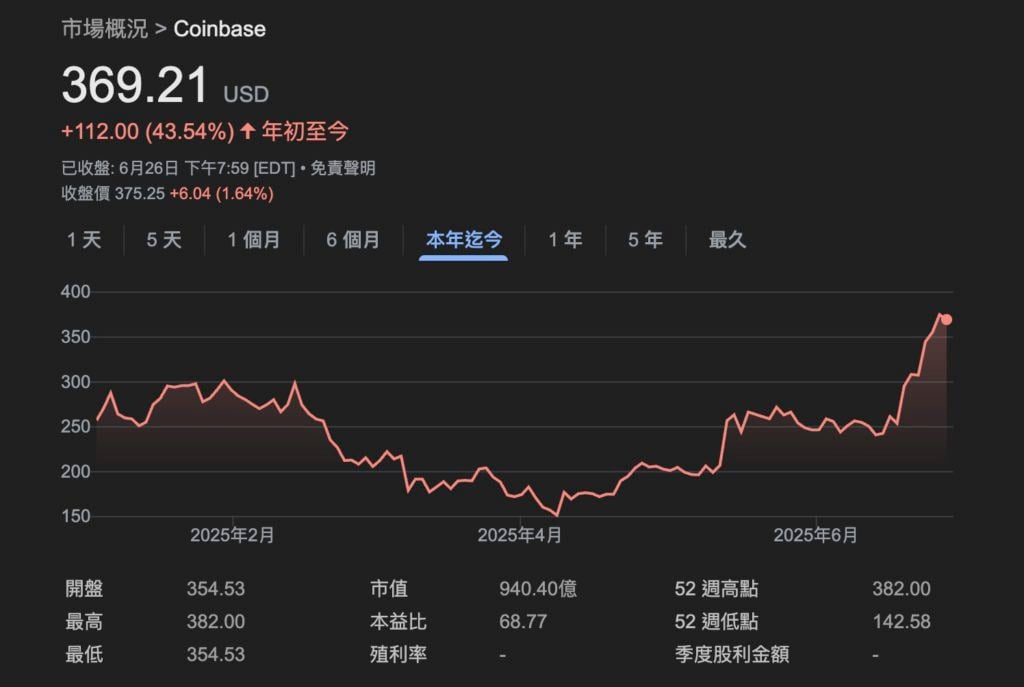 Coinbase 股票今年以来涨幅已超过 43%,股价在 352 至 369 美元区间创下一年新高。如果与 4 月市场抛售期间的低点相比,涨幅更是高达 133%,这都显示投资人对其抱持高度信心。