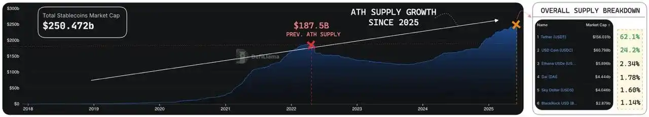目前,稳定币总供应量已攀升至 2510 亿美元,创下历史新高,相较于 2021 年上一轮周期峰值的 1870 亿美元增长了 34% 。这一增长反映了显著的资本流入以及对加密生态系统的信心回升。