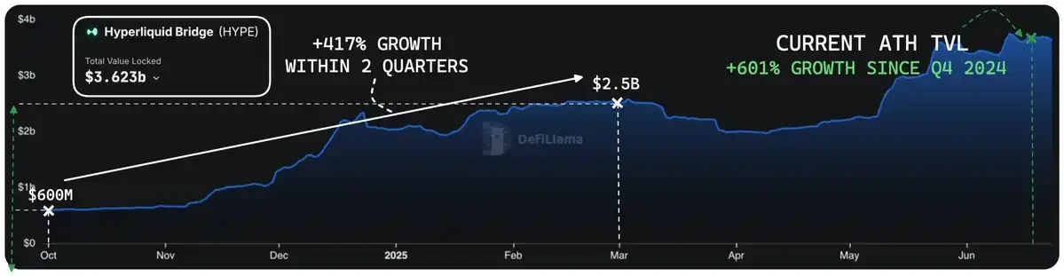这一反转主要得益于 Hyperliquid 的爆发式增长,其总锁仓量 (TVL) 从 2024 年第四季度的 6 亿美元飙升至 2025 年第一季度末的 25 亿美元,增幅高达 417% 。截至目前,Hyperliquid 的桥接存款已创下 36.2 亿美元的历史新高,相较于第四季度基数增长了 601% 。