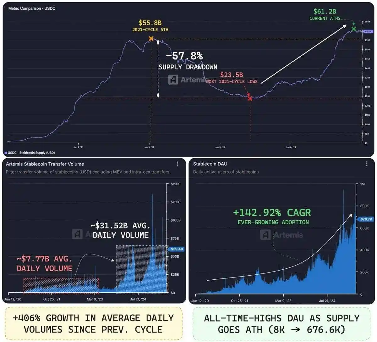 随着 Circle 的上市,USDC 当前流通供应量已达到历史新高的 612 亿美元。这一规模体现了 USDC 从一种简单的交易型稳定币,逐步演变为被认可的核心金融原语的历程。从 2021 年以来:
