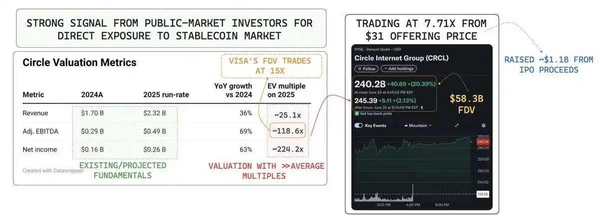 在 582 亿美元市值的基础上,Circle 的市盈率(P/E)倍数已超过 Visa 的近 8 倍(Visa 的市盈率约为 15 倍)。ARK Invest 和 BlackRock 等高知名度机构的坚定投资表明,投资者不仅在为当前的基本面定价,更是在押注其未来实现大规模普及的潜力。