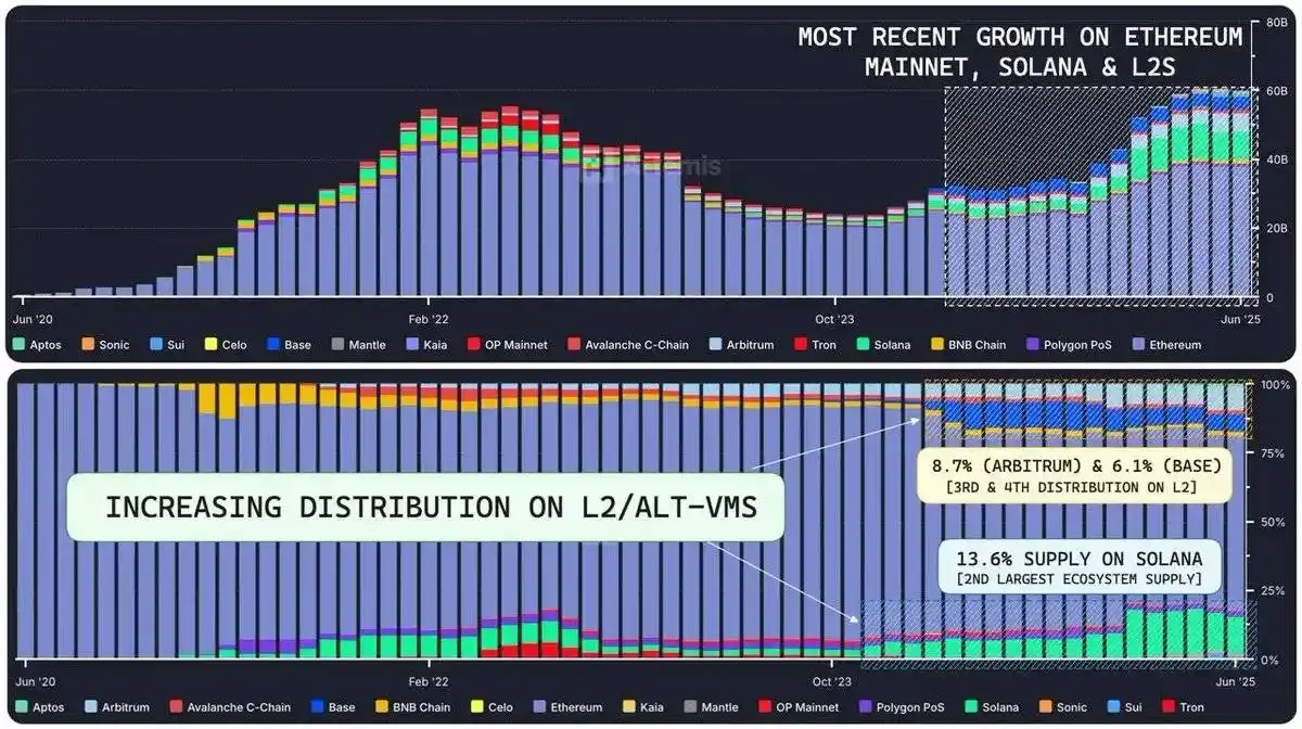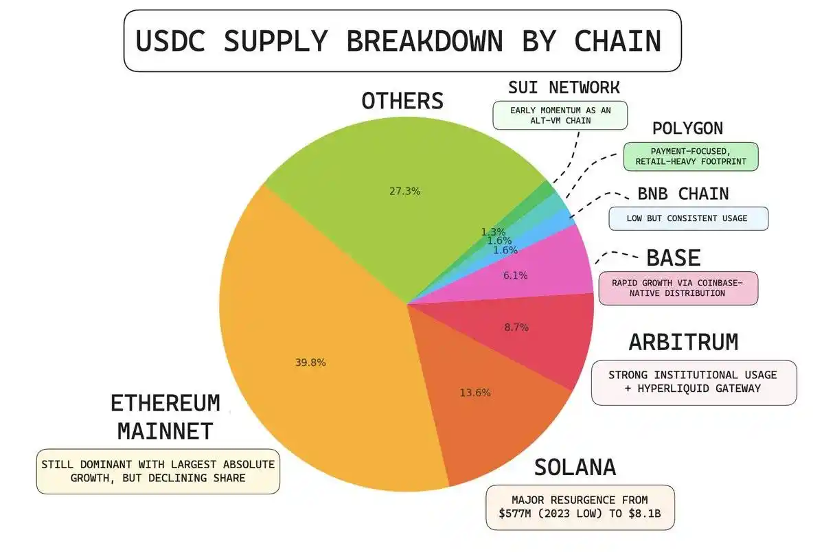 USDC 的供应增长从以太坊为中心逐步转向更广泛的生态系统,包括 Solana、以太坊 Layer 2 和新兴的 Alt-VM 链。