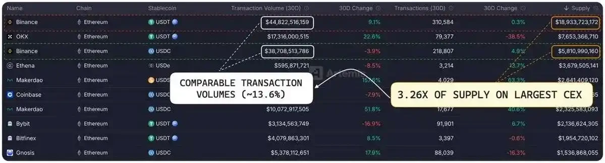 在 Binance 平台上,USDT 以 189 亿美元的供应量占据主导地位,而 USDC 的供应量仅为 58.1 亿美元,约为 USDT 的三分之一。