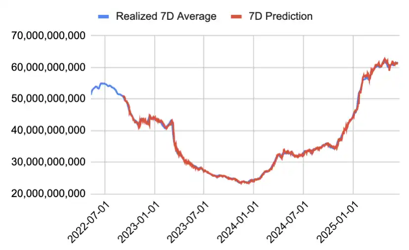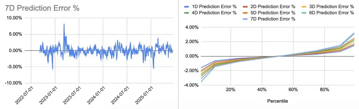 这一方法在预测供应量的短期方向性变化方面非常有效。自 2022 年以来,模型预测的 7 天平均 USDC 总供应量有 80% 的概率落在预测结果的 ± 1.5% 范围内。