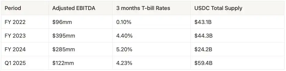 为了维持当前的估值,Circle 必须继续展现强劲的盈利增长轨迹。从历史数据看,Circle 超过 95% 的收入来源于其稳定币的法币资产储备(如银行现金、短期美国国债以及由 BlackRock 管理的 Circle 储备基金)所产生的利息和股息。因此,其收入对短期利率及 USDC 的流通量高度敏感。
