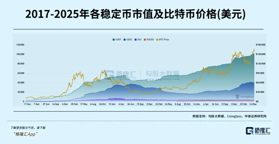 所以大家可以看,稳定币的规模发展基本与比特币的价格同步。比特币价格越涨,越刺激比特币的扩圈,更多的人想参与进来,从而刺激了更多的稳定币需求。