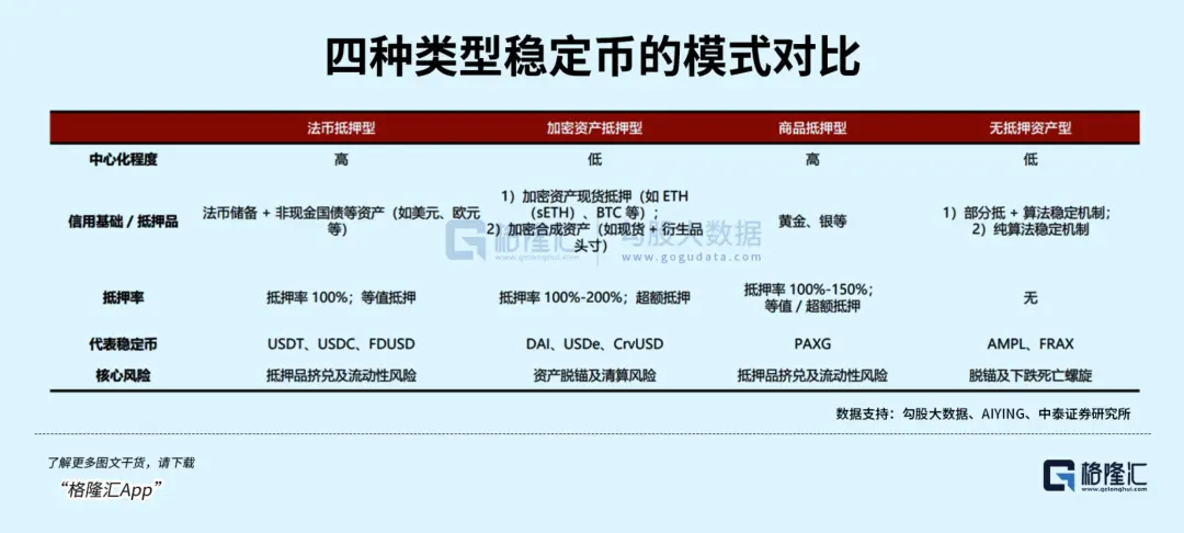 稳定币,顾名思义,就是价格相对稳定的币。它跟比特币这些一样,也属于加密货币。区别是,它的价格与某种稳定的资产相挂钩。一般稳定币分为四种类型,其中法币抵押型是最大的。