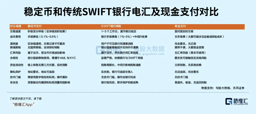 这个场景就是跨境支付。稳定币可以作为高效结算工具,支持跨境转账和在线购物的即时低费率交易。因为它是基于区块链技术,交易双方通过钱包直接交互,无需传统金融体系中的代理行、清算机构等中间层级,最快可在30秒内完成结算且费用率控制在0.1%-1%。而银行需要花费小时至数天,且需要支付平均6%的综合手续费。