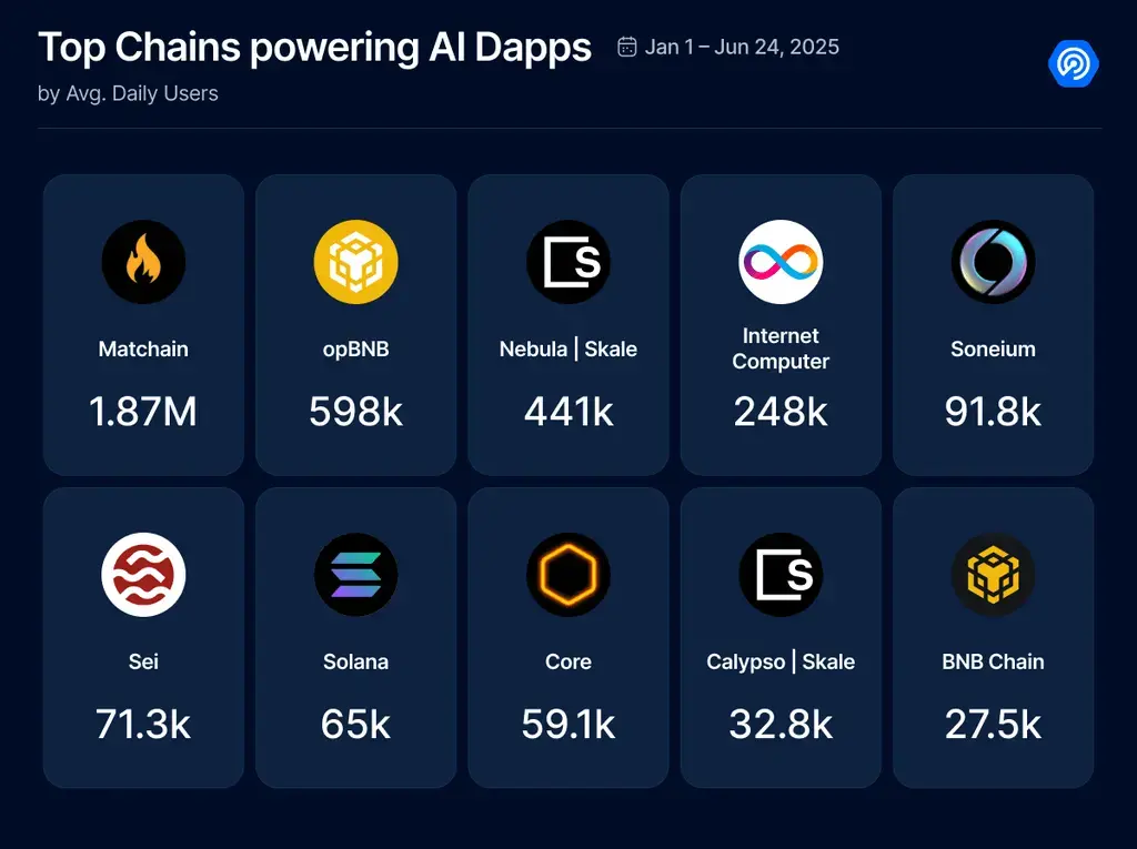 在 2025 年 1 月至 6 月 24 日期间,以下区块链在 AI dapp 使用率方面表现最为活跃: