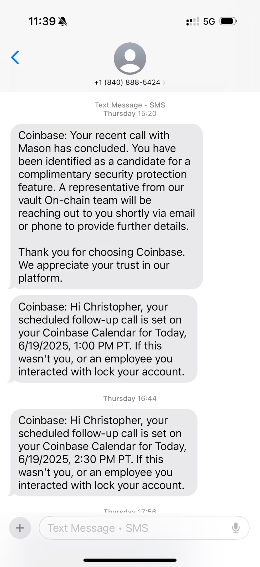 6 月 19 日针对我个人设备和账户发起的钓鱼攻击,是我十年网络安全职业生涯中遭遇过最精密的攻击。攻击者首先制造出我的账户正在多个平台遭受攻击的假象,随后冒充 Coinbase 员工主动提供「帮助」。他们将经典的社会工程学手段与跨短信、电话和伪造邮件的协同战术相结合,所有设计都旨在营造虚假的紧迫感、可信度和规模效应。这场虚假攻击波及面广且极具权威性,而这正是攻击如此具有欺骗性的关键所在。