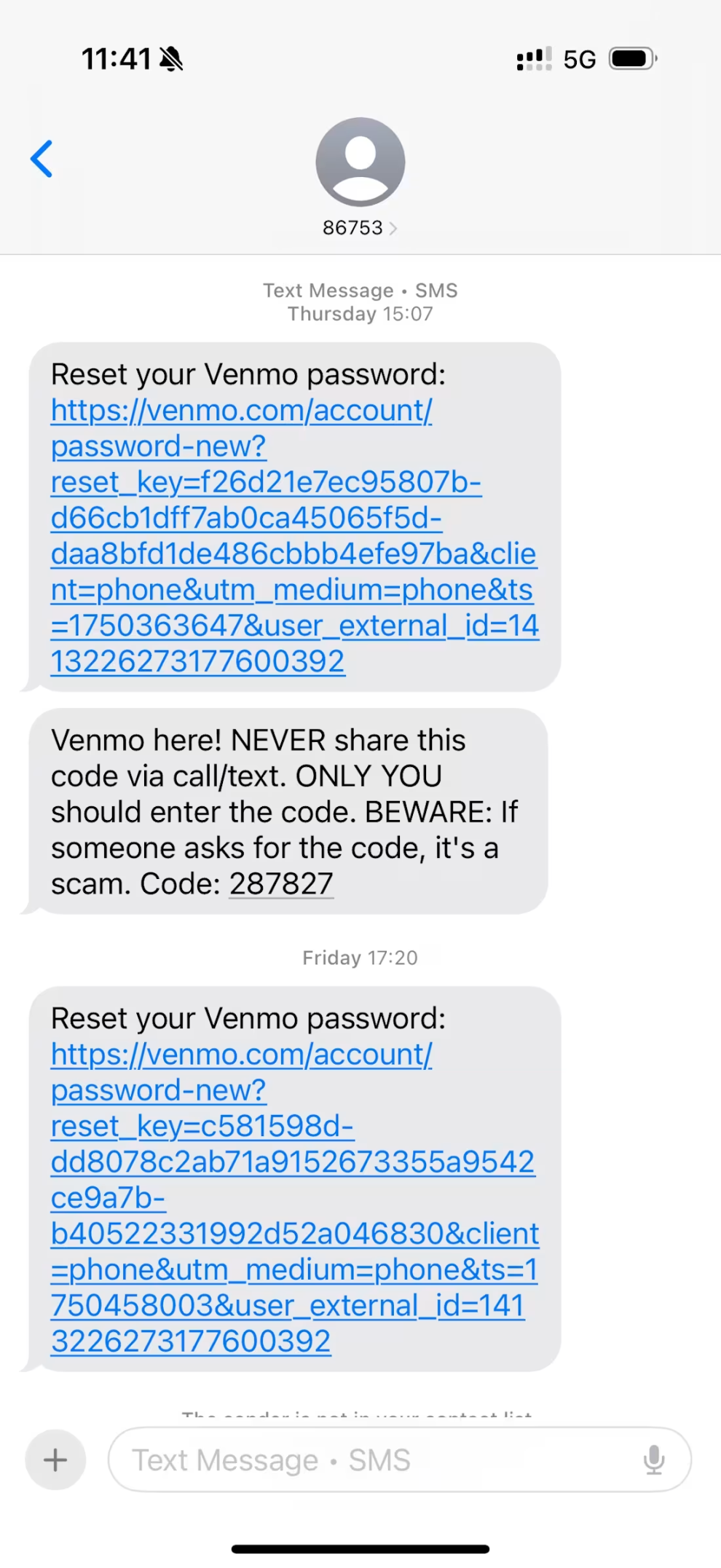 攻击随后升级,我陆续收到据称来自 Venmo 和 PayPal 的一次性验证码,通过短信和 WhatsApp 发送。这是让我相信有人正尝试登录我在各个金融平台的账户。与可疑的运营商短信不同,这些验证码确实来自看似合法的短代码。