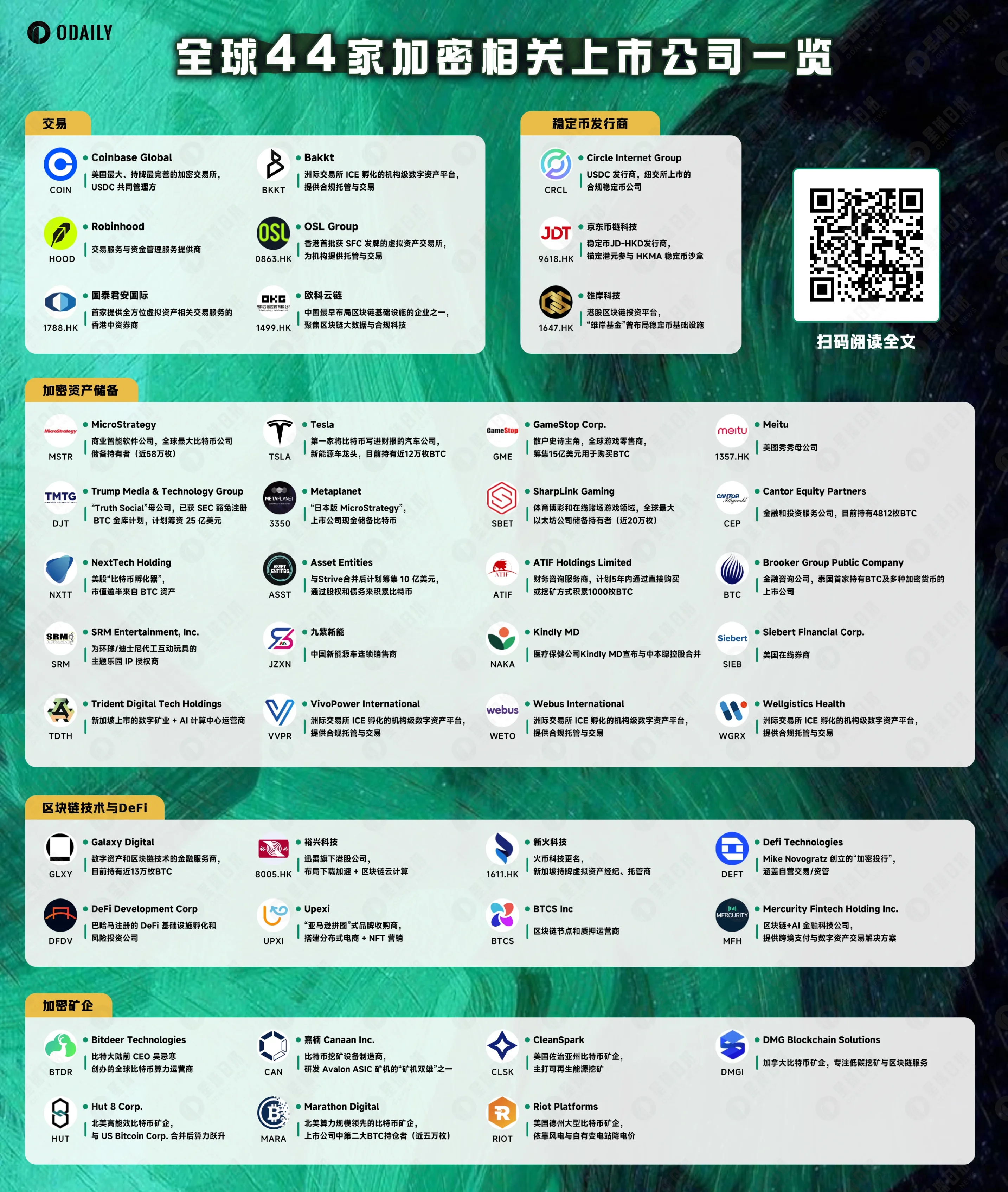 这股热潮背后,藴藏著怎样的资本逻辑与演进趋势?为拨𫔭迷雾,Odaily 星球日报深度扫描全球 44 家代表性上市公司,并依据其核心加密业务属性,提炼五大关键赛道: