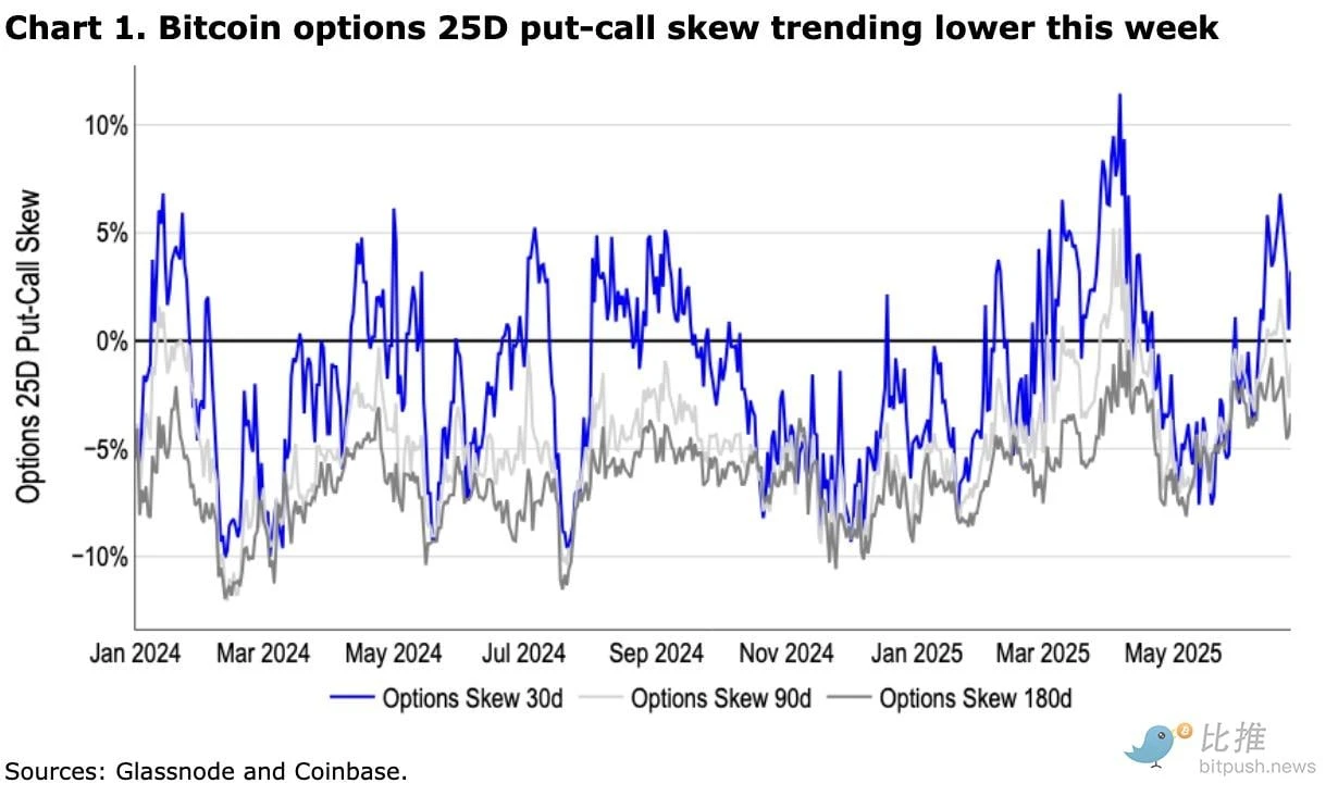 自 6 月 23 日以色列和伊朗达成停火协议以来,市场情绪趋于稳定,COIN 50 指数和美股一同反弹。事实上,比特币 30 天期期权的 25 delta 看跌看涨偏度在经历上周飙升后𫔭始下降,而 90 天和 180 天期合约的偏度则处于负值区域。