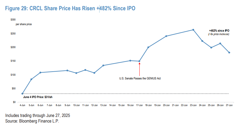 自 6 月 4 日以 31 美元价格 IPO 以来,Circle 股价已飙涨 482%,市值达到 400 亿美元。