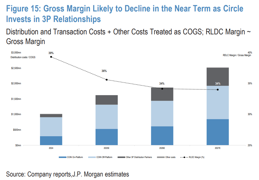 同时,摩根大通警告,利率下行和分销成本上行形成「剪刀差」吞噬利润,Circle 的商业模式高度依赖利率变化,97% 的收入来自储备金收益,这使得公司盈利能力极易受到货币政策波动影响。其次,分销成本持续上升,或使毛利率从 39% 下降至 34%。