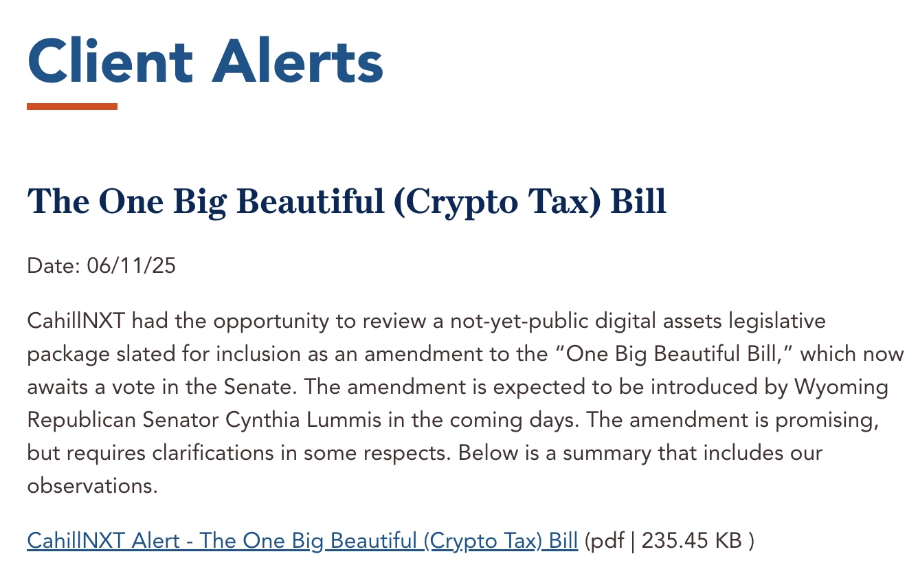 2025 年 6 月 11 日,Cahill 发布了一个关于即将提出的 加密资产立法修正案 的分析报告。报告称:这一“预计将由怀俄明州共和党参议员 Cynthia Lummis 提出”、“尚未公开的数字资产立法方案”,“计划作为大而美法案的修正案纳入其中”。