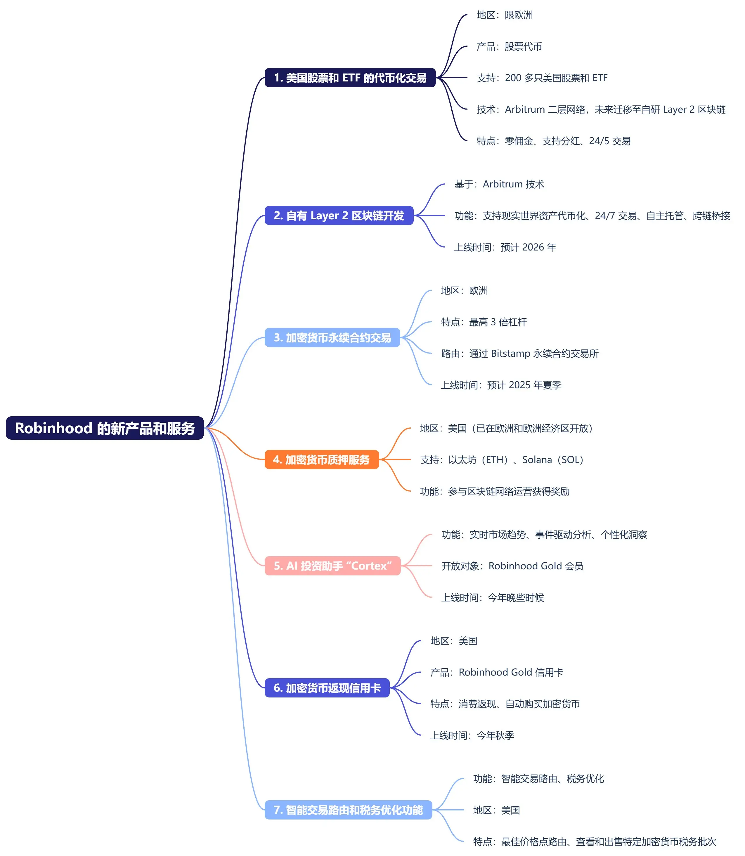 其中,Robinhood 更是甩出战略组合拳,直接从互联网券商跃迁为“加密驱动的全能投资平台”。在法国戛纳的发布会上,其高调公布了全新加密战略矩阵:美股代币化交易、Layer2 公链、信用卡返现购币等。