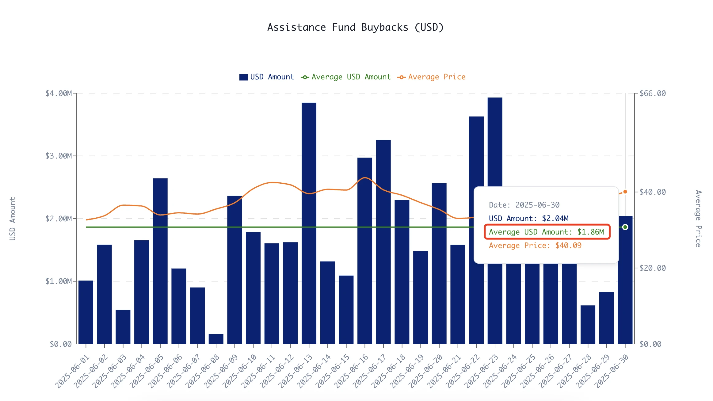 据 ASXN Data 网站数据 ,根据截至 2025 年 6 月 30 日的过去 30 天链上数据,Hyperliquid 协议的 HYPE 代币日均回购额为 186 万美元。可以说,这一回购资金是总量 10 亿枚、流通量约为 3.3 亿枚的 HYPE 代币最大的上涨动力。