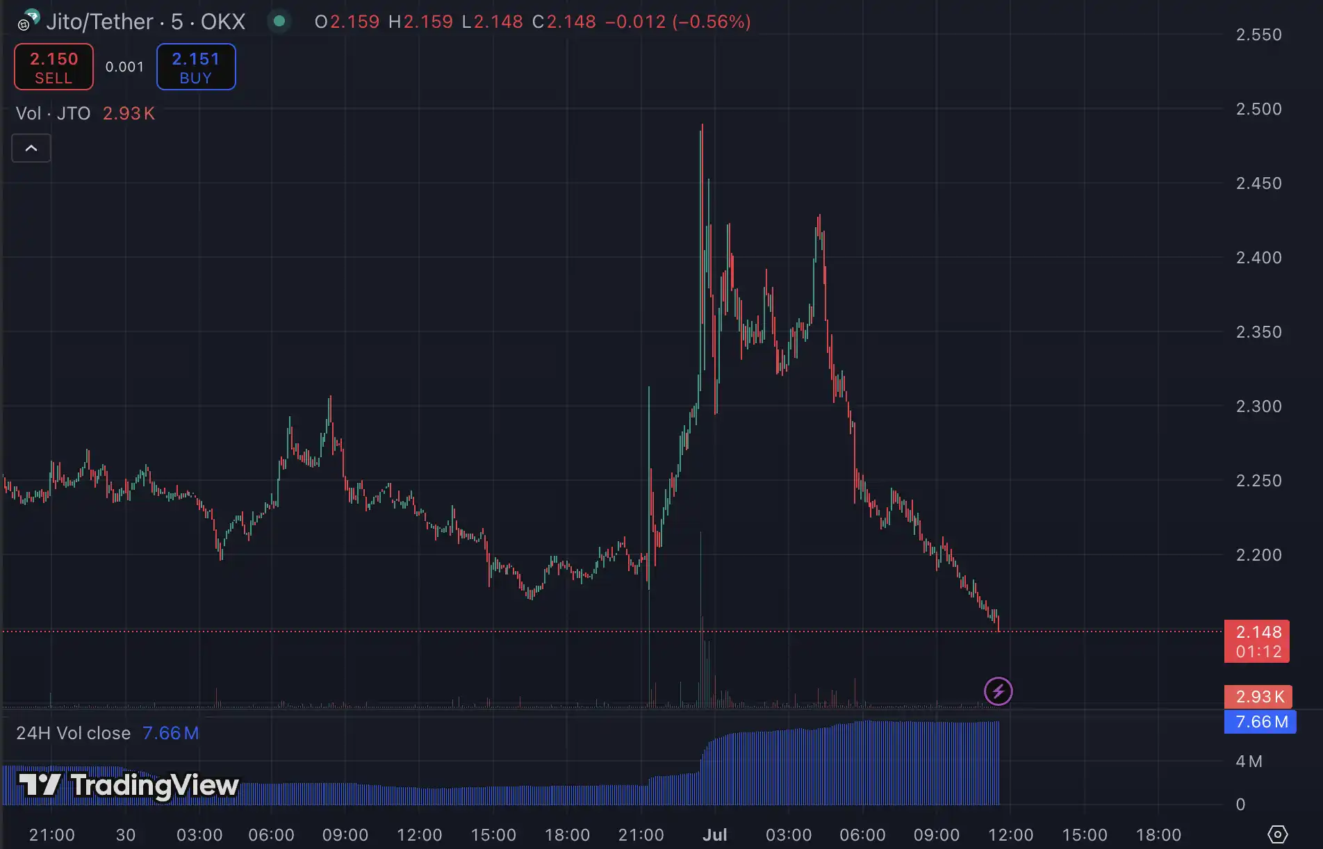 显然有了 DFDV 的前车之鉴,市场在 Solana 的「功能型 ETF」通过后自然的联想到了这个协议,JITO 在消息后短时间内也上涨了 14% 左右,一度突破 2.49 美元但随即持续下跌,现报价 2.14 美元。
