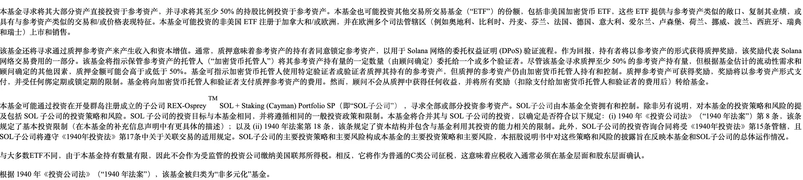 而根据发行方透露,该基金采用的 C-Corp(普通的 C 类公司)架构能持有现货 SOL 并进行链上质押,从而获取收益并归入基金资产,但也因此该 ETF 并不享有「ETF 基金免税通道」待遇,而是需要在公司层面缴纳所得税。这一结构此前曾受到监管质疑,但 REX 团队更新了招股书并解决了 SEC 的问题,最终获得了「无进一步异议」的反馈。