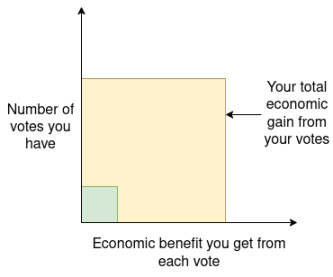 试想一个投票系统(例如社交媒体平台上的点赞和转发):若用户 A 的资源是用户 B 的 10 倍,那么其投票权也会是 B 的 10 倍。但从经济角度看,每单位投票权给 A 带来的收益,是给 B 带来的 10 倍(因为 A 的体量更大,任何决策对其经济层面的影响都会更显著)。因此,总体而言,A 的投票对自身的益处,是 B 的投票对自身益处的 100 倍。正因如此,我们会发现 A 会投入多得多的精力参与投票、研究如何投票才能最大化自身目标,甚至可能会战略性地操纵算法。这也是代币投票机制中「巨鲸」能产生过度影响的根本原因。