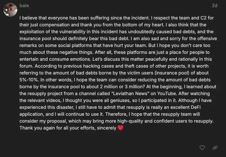 BlockBeats:那你觉得出事之后谁应该负责?Resupply 团队在事情发生后做了哪些关键决策?如果对比成熟的 DeFi 协议平台,他们的应对流程有哪些明显差距?