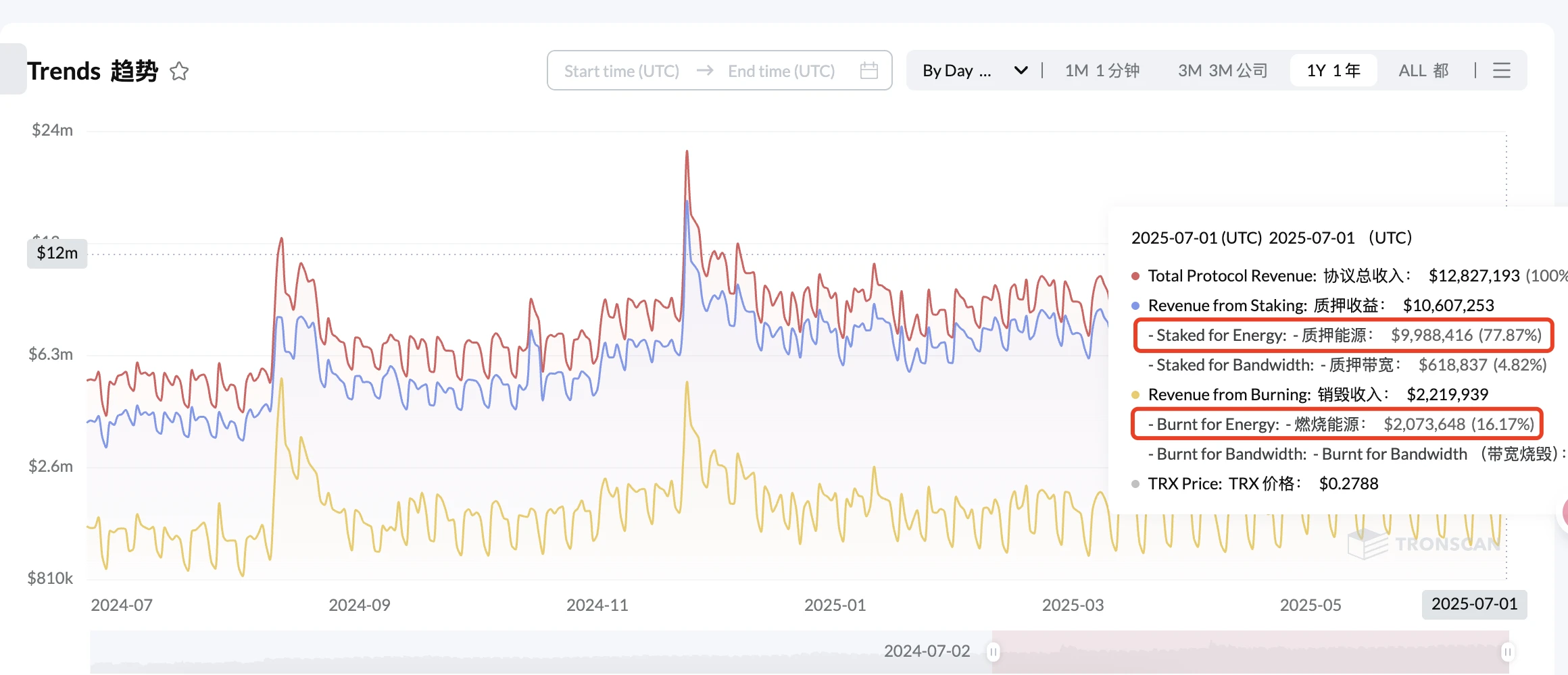 据 Tronscan 官网数据 ,过去一年,波场 TRON 协议收入高达 31.5 亿美元;过去 30 天,协议总收入高达 3.43 亿美元;仅 7 月 1 日单日,协议总收入就高达 1283 万美元。这之中,与 USDT 等稳定币转账交易相关的能量质押、燃烧相关收入占比高达 94% 左右,可以说,USDT 在波场 TRON 生态高达 99.02% 的占比 ,为其协议收入做出了几乎同等的贡献。
