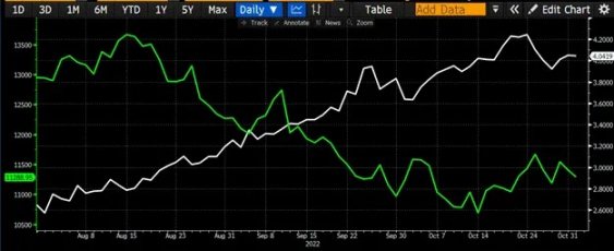 2022 年第三季度的情况很糟糕。下图中,纳斯达克 100 指数(绿色)和 10 年期国债收益率(白色)显示,随着收益率飙升,股市大幅下跌。