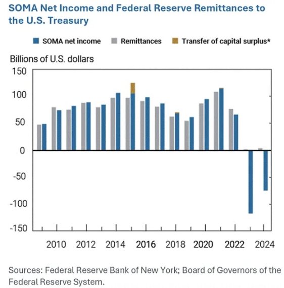 但对美联储而言,问题在于准备金余额利息会随利率上调而增加。这并非好事,因为美联储债券组合的未实现亏损也会随利率上升而扩大。结果就是,美联储已处于资不抵债状态,且现金流为负。不过,这种负现金流状况纯粹是政策选择的结果,是可以改变的。
