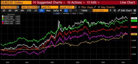 美国财政部长 Scott Bessent(BBC)面临的主要问题,与前任部长 Janet Yellen(「Bad Gurl」)面临的如出一辙。他们的上司(美国总统以及参众两院的政客们 )喜欢花钱却不想增税,于是,财政部长就得想办法以合理成本通过举债为政府融资。很快就很明显了,市场不愿高价(即低收益率 )购买任何过度负债的发达经济体的长期政府债券。这就是过去几年 BBC 和「Bad Gurl」一直盯着的那场「末日戏码」般的拉锯战…… 简直让人头大: