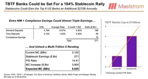我知道许多读者想把辛苦赚来的钱投入 Circle(股票代码 CRCL)或其他新兴稳定币发行方。但不要忽视 TBTF 银行在稳定币领域的盈利潜力。若以 TBTF 银行 14.41 倍的平均市盈率,乘以成本节约和稳定币净息差(NIM)潜力,结果将达 3.91 万亿美元。目前 8 家 TBTF 银行的总市值约为 2.1 万亿美元,这意味着稳定币可能推动这些银行的股价平均上涨 184%。如果说有什么非共识交易能让投资者大规模操作,那就是基于这一稳定币逻辑,做多 TBTF 银行的等权重组合。