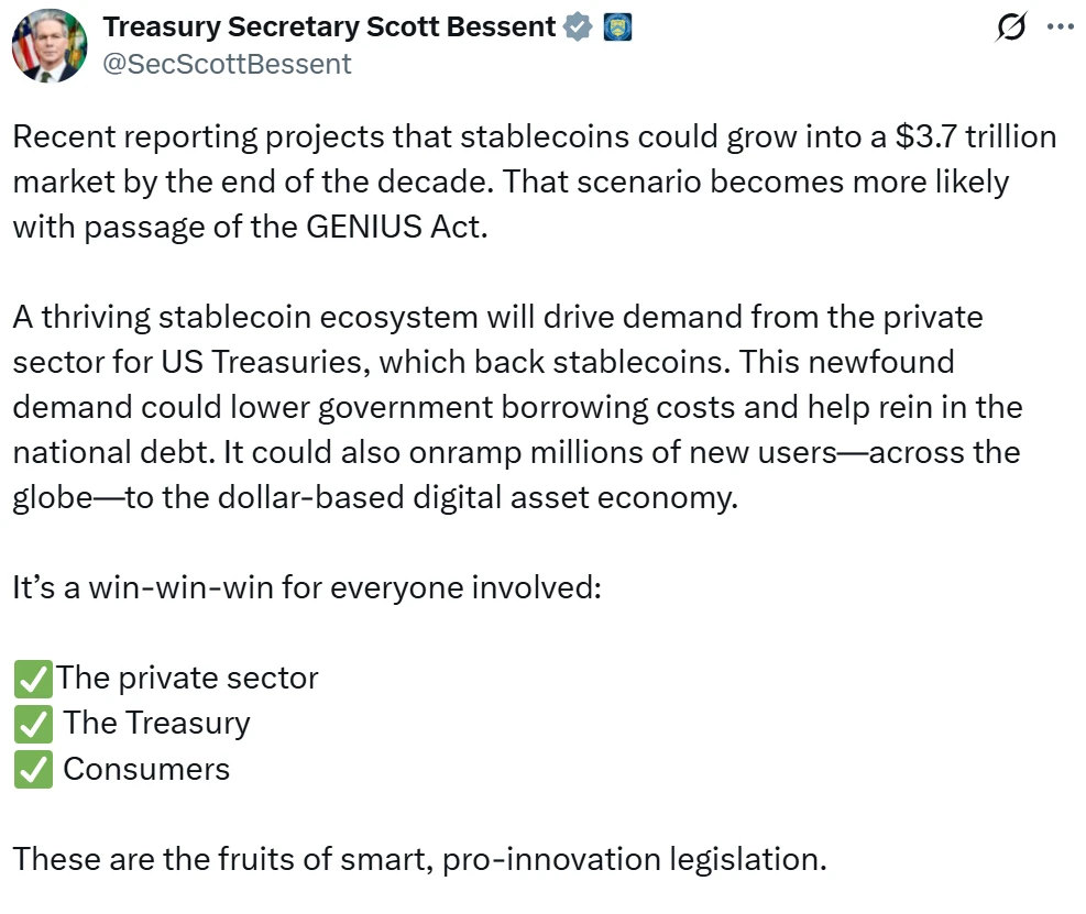 他们为何如此看涨?因为美国财政部长 Scott Bessent(简称 BBC)认为: 一个繁荣的稳定币生态系统将推动私营部门对美国国债的需求,因为国债是稳定币的支撑资产。这种新需求可能降低政府借贷成本,并有助于控制国家债务。