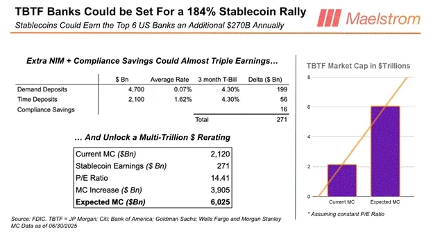 我知道,许多投资者正摩拳擦掌,想把辛苦钱投进 Circle (CRCL)或其他新发行的稳定币项目。但别忽视 TBTF 银行的潜力。如果我们将 TBTF 银行的平均市盈率(14.41 倍)乘以稳定币带来的成本节省与净息差收益,其估值可达 3.91 万亿美元。而目前八大 TBTF 银行的总市值约为 2.1 万亿美元。换句话说, 稳定币有望将 TBTF 银行股价平均提升 184% 。 若你在寻找一个“反共识、可大额建仓”的交易机会,那就是: 做多一篮子等权配置的 TBTF 银行股票。
