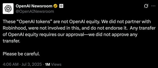 就在今日,针对Robinhood推出赠送价值5欧元的OpenAI代币的用户推广行为,OpenAI发布公告回应,表示这些‘OpenAI代币’不是OpenAI的股权,我们没有与Robinhood合作,没有参与其中,也不支持它”,强调“任何对OpenAI股权的转让都需要我们的批准——我们没有批准任何转让”。