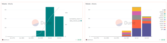 当然,仅从目前来看,这一担心还为时过早。口号虽然震天响,但股票代币化的实际流动性却并未让人满意。根据Dune数据,自6月30日上线以来,xStocks总交易额仅约1249万美元,用户数量也不过1万有余,从市场深度来看,仅有SPYx这一个币种的24小时交易量可稳定在百万美元以上,足以看出股票代币化仍有相当长的一段路要走。