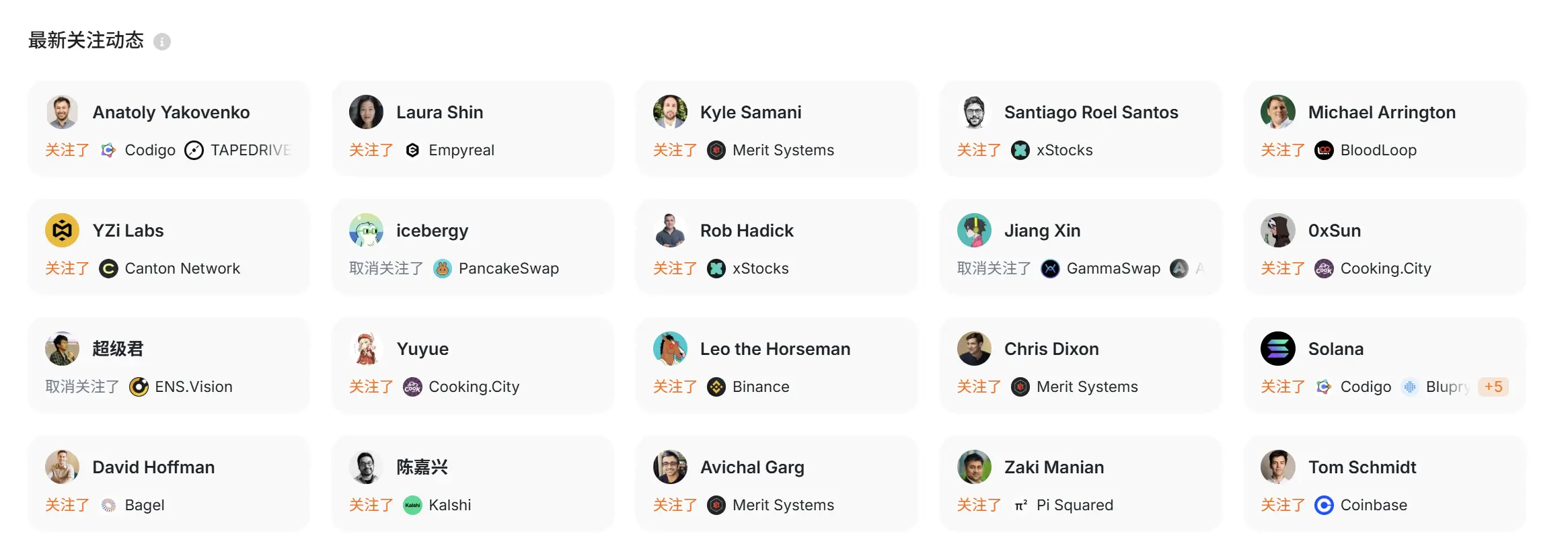 一个月前,RootData 上线了 推特关注流功能 ,用户可以追踪任何项目与KOL的每日关注动态, 包括关注、被关注、取关与被取关等动态。由此带来的功能点就是,用户可以很直观地发现某个项目的最早期知名关注者 ,特别是回溯统计哪些头部 KOL 在这个关注列表中出现频次更高。